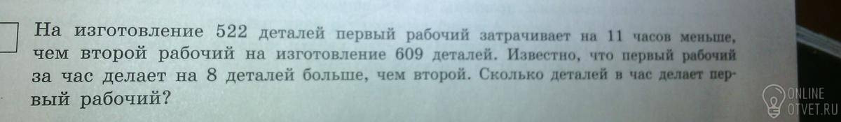 за 1 час деталей 1 рабочий делает 522 : х, а 2 рабочий 609 : х+11