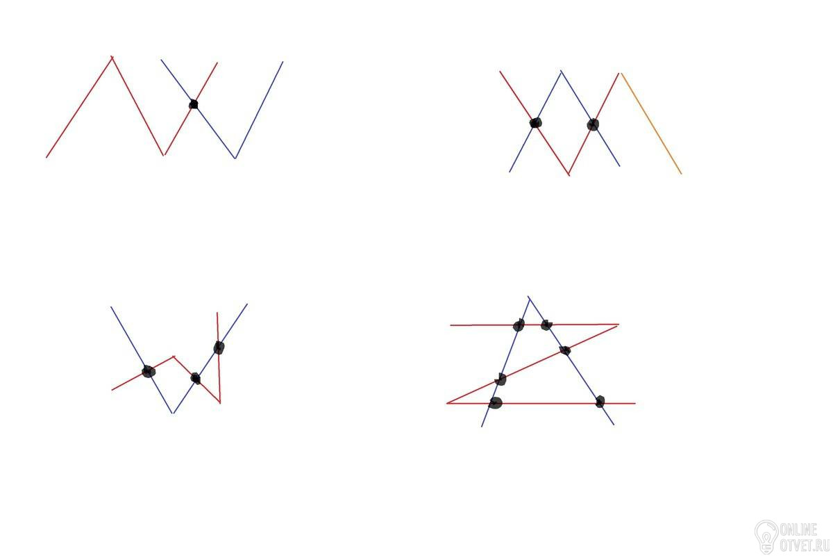 Красная ломаная линия состоит из 3 звеньев а синяя из 2 звеньев.Нарисуй эти ломаные так,чтобы в их пересечении:а)была только 1 точка;б)было только 2 точки ;в)было только 3 точки;г)было только 6 точек