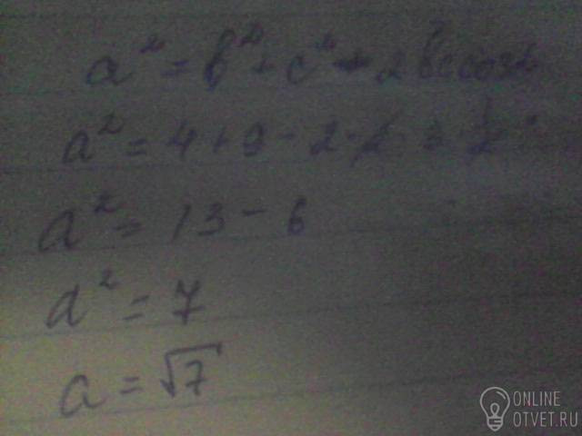 В треугольнике ABC стороны AB=2см,АС=3см, кут А=60градусов . найдите ВС.