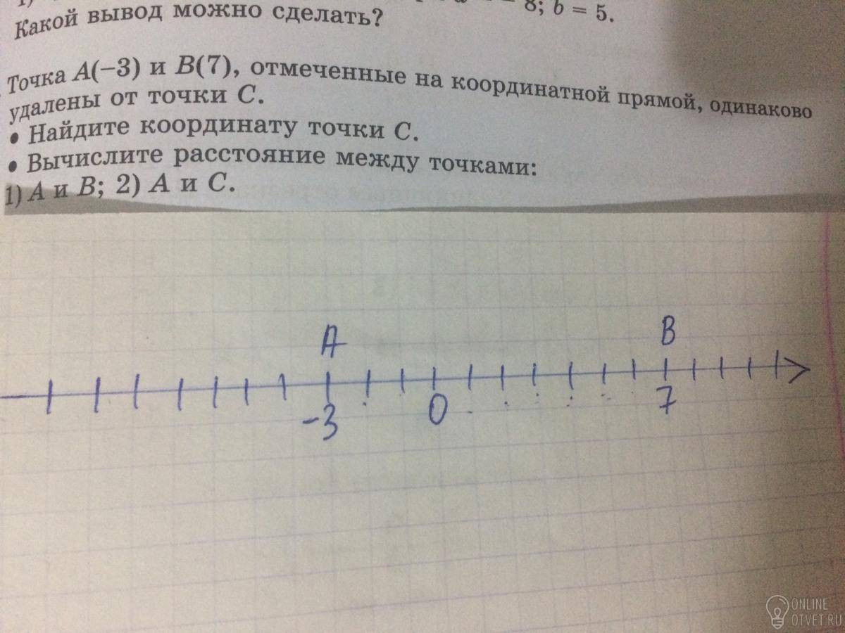 Найдем координату С - середину, ДЛЯ ЭТОГО НАДО СЛОЖИТЬ КООРДИНАТЫ КОНЦОВ ОТРЕЗКА И РАЗДЕЛИТЬ ПОПОЛАМ. ЕСЛИ ПОЛУЧАЕМ ОТРИЦАТЕЛЬНОЕ ЧИСЛО, БЕРЕМ ЕГО ПО МОДУЛЮ, ТАК КАК РАССТОЯНИЕ ОТРИЦАТЕЛЬНЫМ НЕ БЫВАЕТ: