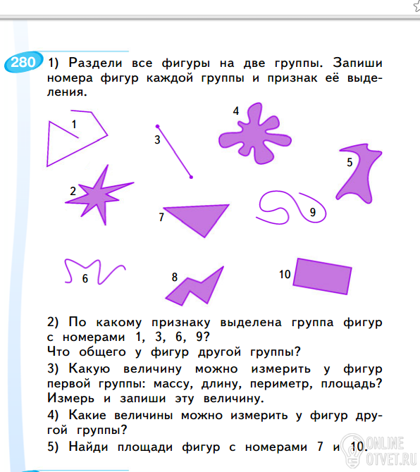 1,3,6,9? Что общего у фигур другой группы? 3) Какую величину можно измерить у фигур перво: массу, длину, периметр, площадь? Измерь и запиши эту величину. 4) Какие величины можно измерить у фигур другой группы? 5) Найди площади фигур с номерами 7 и 10.