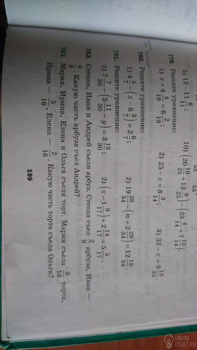 781) 7ц7/30-5ц11/30+у=3ц19/30; у=3ц19/30-7ц7/30+5ц11/30; у=1ц+(19/30+11/30-7/30)=1ц23/30;/////////задача783) 1) 3/16+5/16+2/16=10/16 торта съели 3 девочки; 2) 1-10/16=16/16-10/16=6/16 торта съела Ольга.( если умеете сокращать, то 6/16=3/8)))))) ц - целая