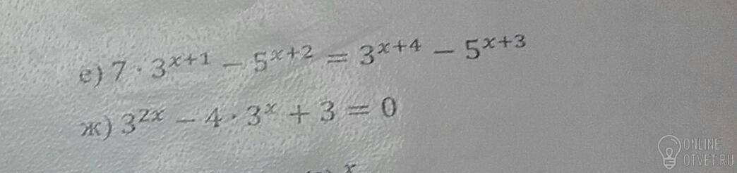 Ж) 3^x обозначим за t, тогда получится квадратное уравнение t^2-4t+3=0 отсюда t1=1, t2=3. Значит 3^x=1 и 3^x=3