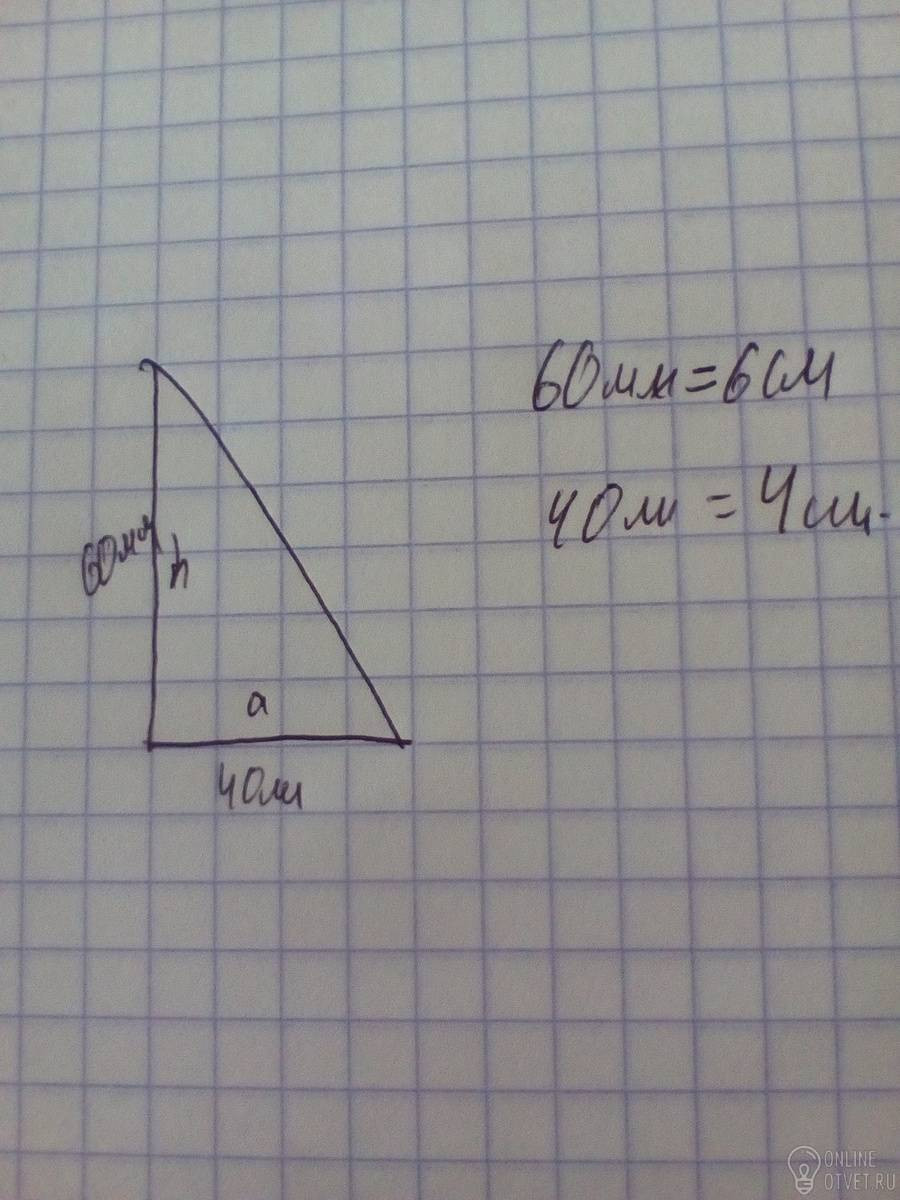 Один катет прямоугольного треугольника равен 60 мм а второй катет равен 40 мм . а ) найдите площадь этого треугольника б) начертите этот треугольник