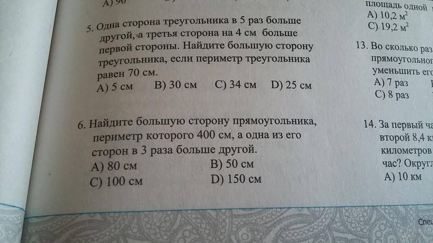 5. Задание принимаем одну сторону за х, другая сторона будет 5х, третья сторона 5х+4. Получаем уравнение х+5х+5х+4 = 70, упрощаем 11х=66, х=6, это одна из сторон. 5*6=30 см вторая сторона, большая 30+4=34