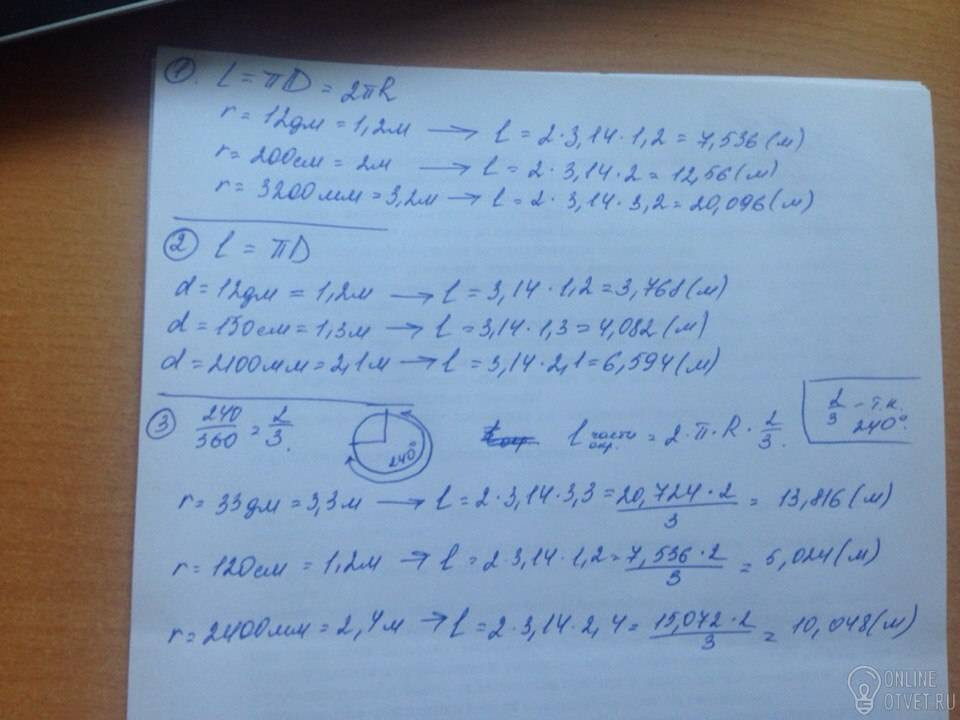 3)чему равна длина круга отмеченной части круга при R=33дм.120см.2400мм.