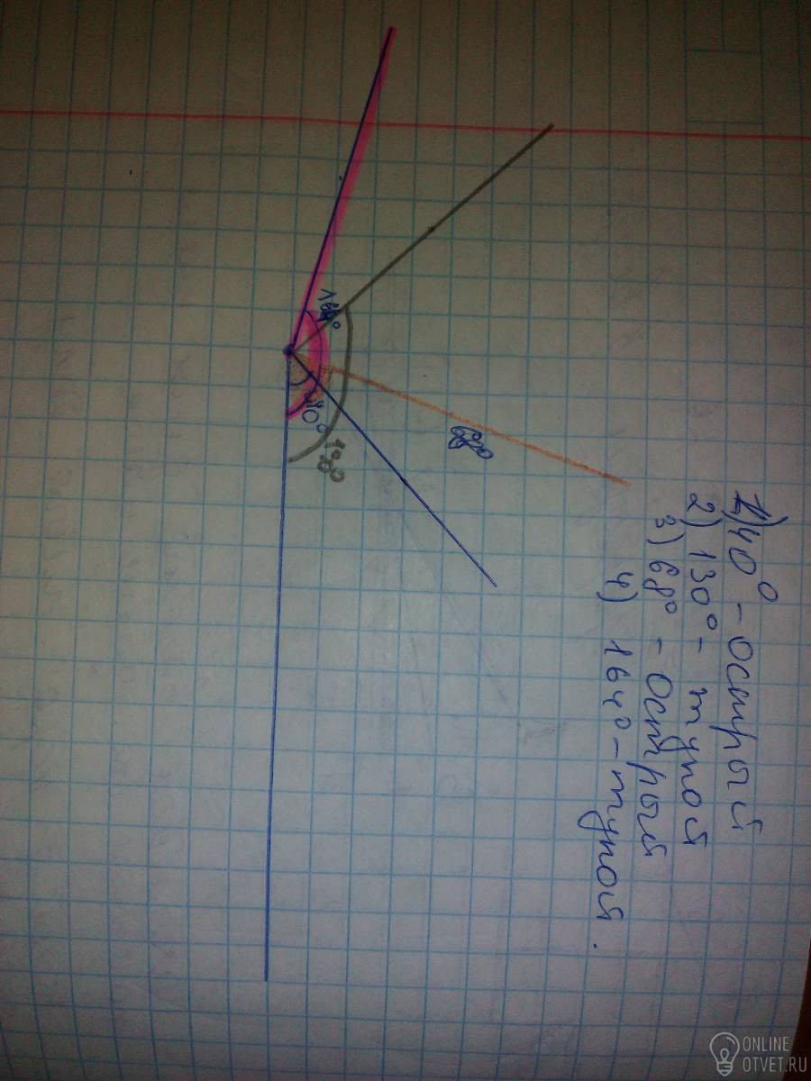 Проведите луч. Отложите от этого луча угол,градусная мера которого равна1)40°2)130°3)68°4)164°. Определите вид каждого из построенных углов.