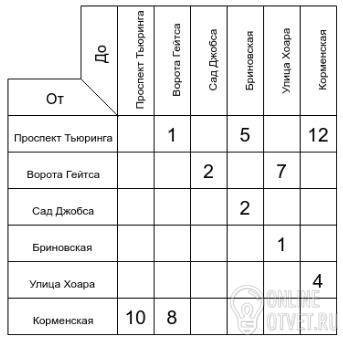 Даша-путешественница приехала в очередной город с запутанной схемой метро. Схема представлена в виде таблицы, где указано, сколько минут ехать от одной станции до другой. Если же ячейка пуста, значит, прямого пути между станциями нет. Помогите Даше найти самый быстрый путь со станции Проспекта Тьюринга на станцию Корменовская и запишите в ответ одно число — сколько времени она потратит на дорогу.