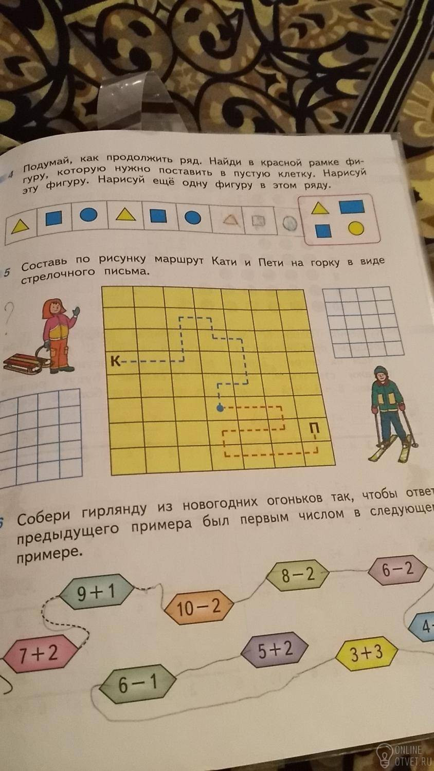 Петя: вниз, влево, влево, влево, вверх, вправо, вправо, вверх, влево, влево. (Вместо слов поставь стрелочки).