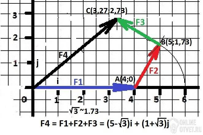 Силы векторов F1,F2,F3 действуют в плоскости на материальную точку. Ввести систему координат. Найти координаты сил в введенной системе. Определить модуль и направляющие косинусы равнодействующей силы, если вектора по модулю F1=4, F2=2, F3=2, (F1,F2)=60 градусов, (F1,F3)=150 градусов.