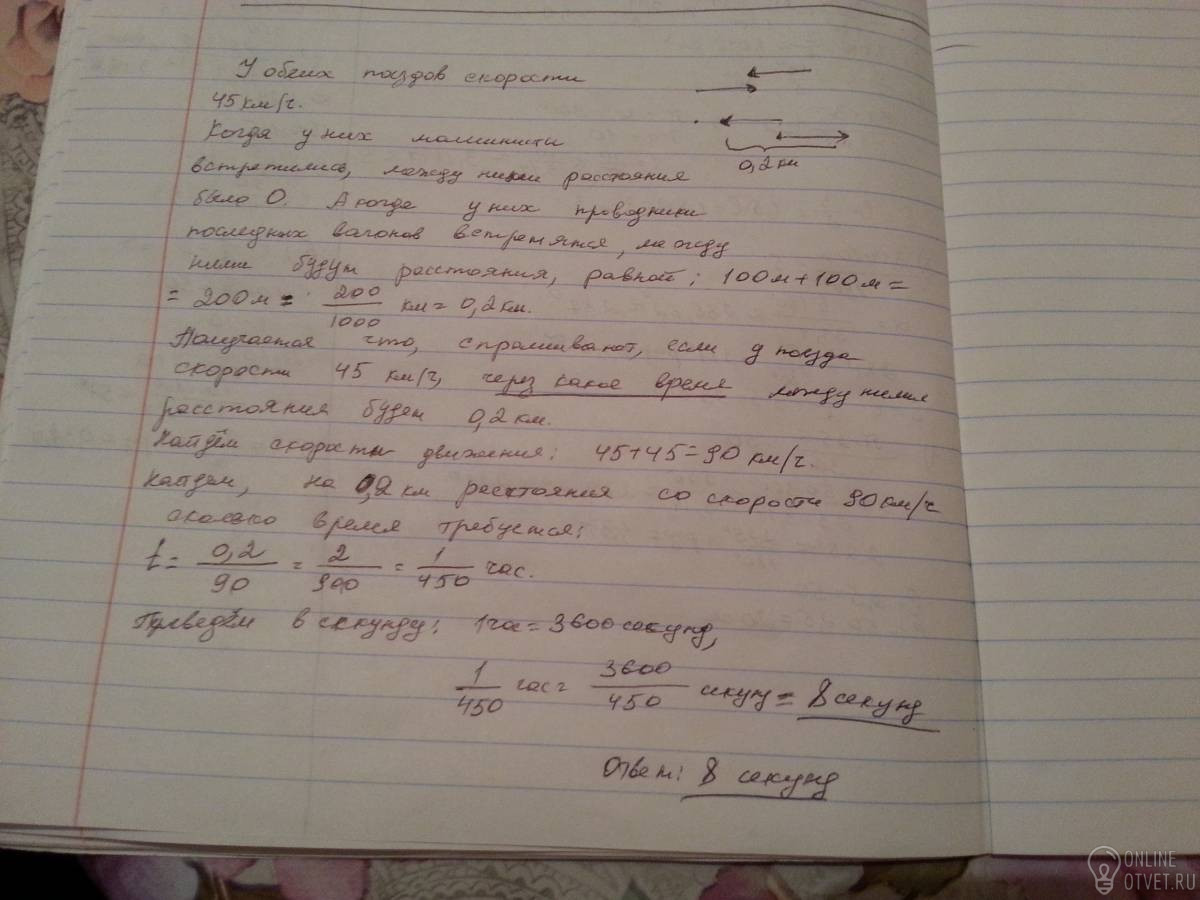 ДВА ПОЕЗДА ОБА ДЛИНОЙ 100 МЕТРА ДВИЖУТСЯ НАВСТРЕЧУ ДРУГ ДРУГУ С ОДИНАКОВОЙ СКОРОСТЬЮ 45 КМ В ЧАС СКОЛЬКО ВРЕМЕНИ ПРОЙДЕТ ОТ МОМЕНТА КОГДА ВСТРЕТЯТСЯ МАШИНИСТИ ДО МОМЕНТА КОГДА ВСТРЕТЯТСЯ ПРОВОДНИКИ ПОСЛЕДНЫХ ВОГОНОВ