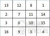 Используя числа от одного до 16 составить квадрат 4 на 4 чтобы сумма каждого столбца каждой строки и большой диагонали была равна 34