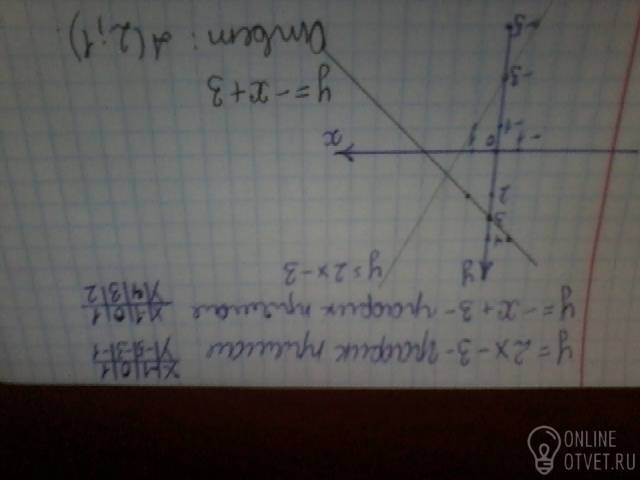 Постройте график функции , заданной формулой y=2x-3 и y=-x+3.Найдите точку пересечения графиков.