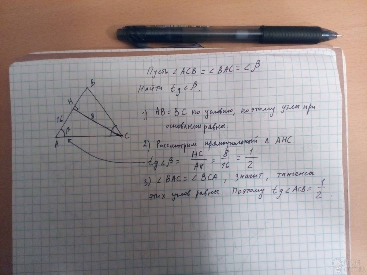 В треугольнике авс ав=вс,высота сн равна 8,ан=16. Найдите тангенс угла асв