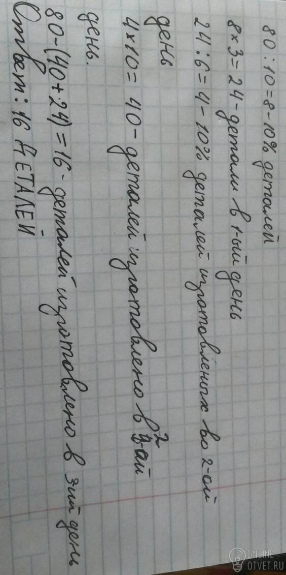 Токарь за 3 дня изготовил 80 деталей . В первый день он выполнил 30%всей работы . Известно что количество деталей изготоаленных в первый день сотавляет 60 % количества деталий изготовленных во 2 день . Сколько деталей изготовел токарь в 3 день
