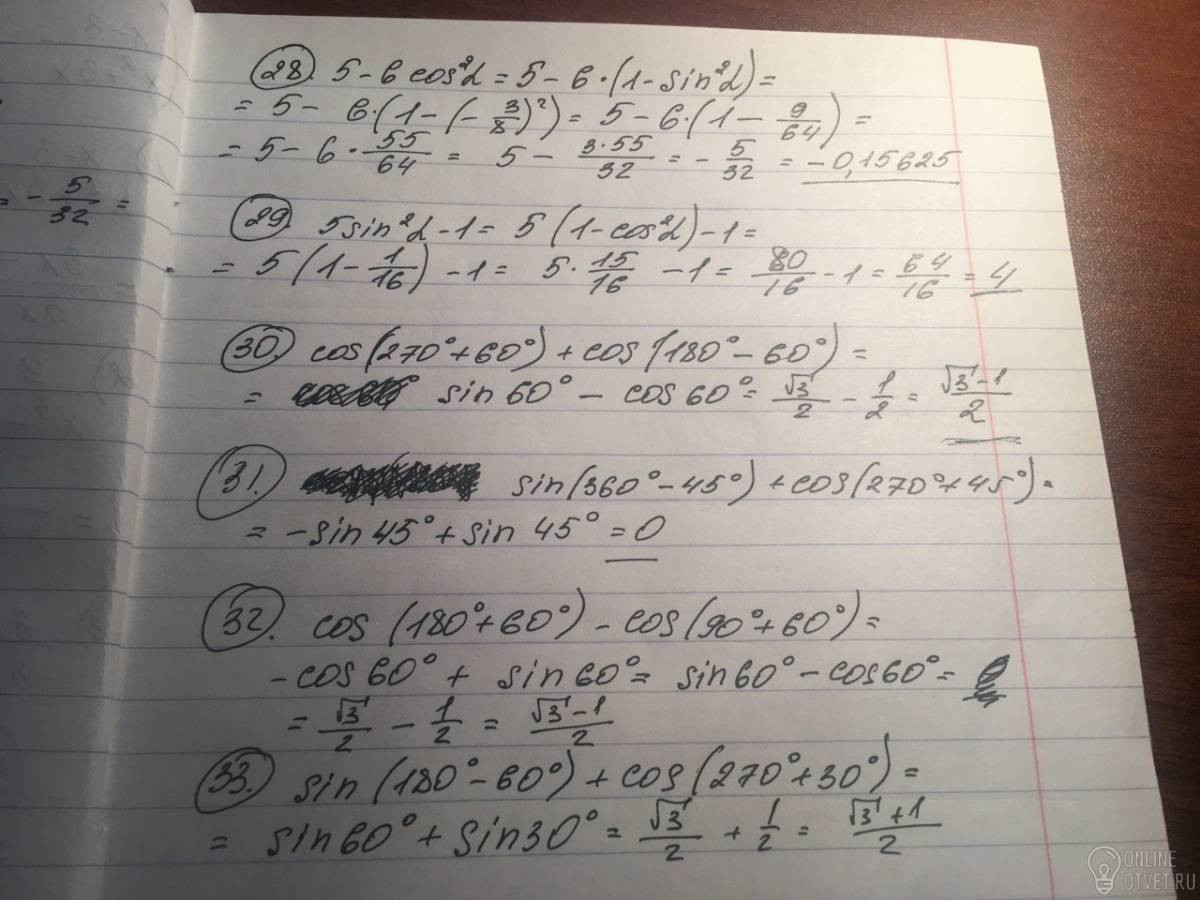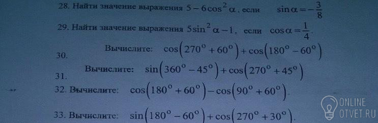 В первых двух применяем основное тригонометрическое тождество (sin²x+cos²x=1). В других формулу приведение (если в скобках 90°, 270° и т.д., то cos меняем на sin, sin на cos, tg на ctg, ctg на tg). И не забываем смотреть в какой четверти у нас получится, иначе потеряем знаки.