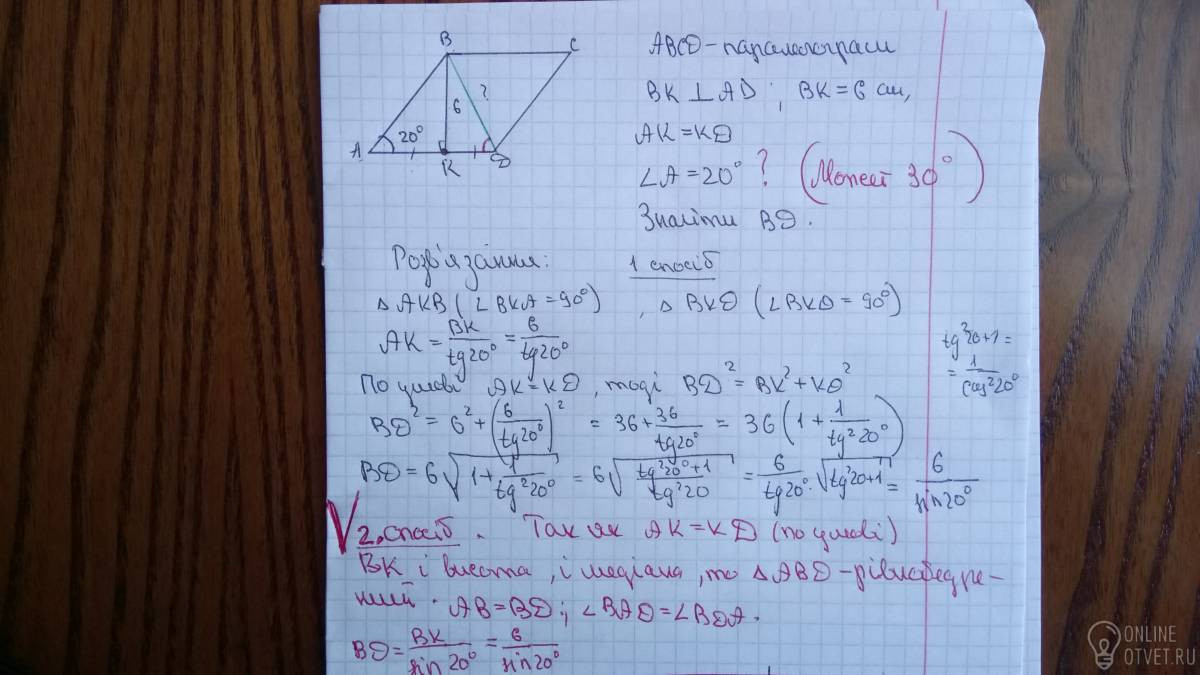 Висота паралелограма , проведена з вершини тупого кута , дорівнює 6 см і ділить сторону паралелограма навпіл. Знайдіть меншу діагональ , якщо його гострий кут дорівнює 20 градусів
