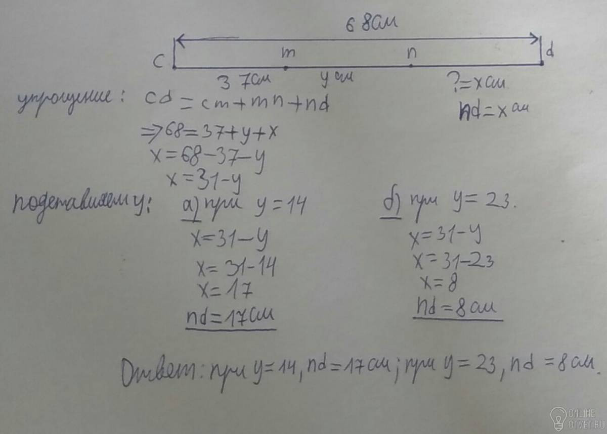 На отрезке cd отмечены точки m и n так, что точка m лежит между точками c и n. Найдите длину отрезка nd, если cm=37 см, mn=y см и cd=68 см. Упростите получившееся выражения и найдите его значение при y=14 см и при y=23