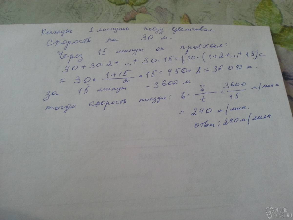 Поезд,отъезжая от станции,равномерно увеличивал скорость на 30 метров в минуту.Найди скорость поезда в начале 15 минуты разгона.В ответе кажи число.