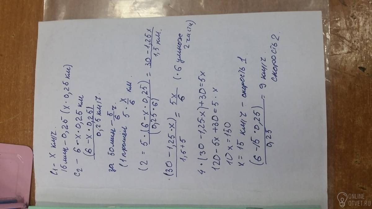 Два лыжника, находясь друг от друга на расстоянии 6 км, вышли одновременно на встречу друг к другу и через 15 мин встретились. Когда же они вышли из одного пункта в одном напралении , но через 50 мин один отстал от другого на 5км. Какова скорость каждого лыжника.