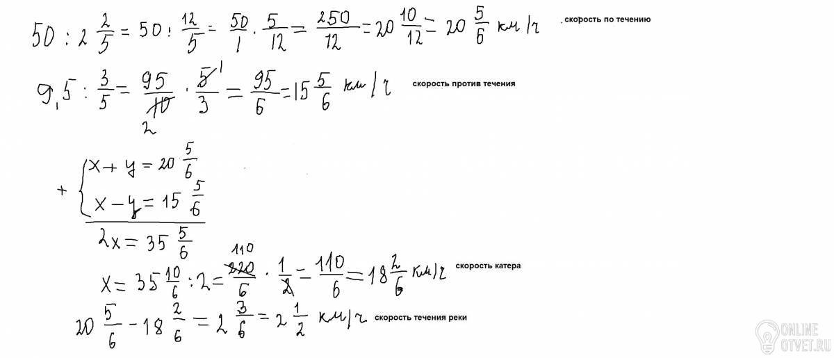 Катер проплив за течією річки 50 км за 2 цілих 2/5 год, а потім 9,5 км проти течії за 3/5 год. Знайдіть швидкість течії річки