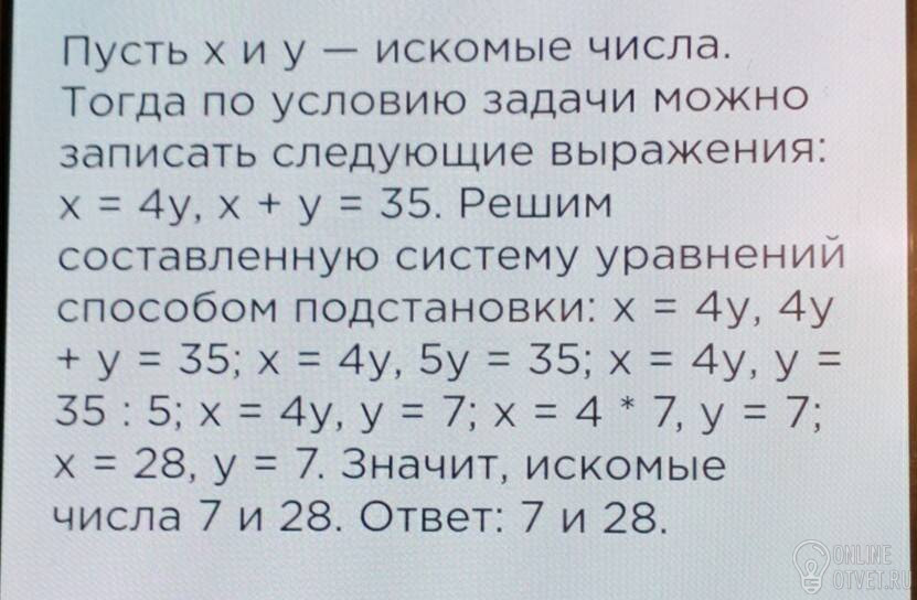 Помгите решить задачу с помощью уровнения . Одно число в 4 раза больше чем другое. Найдите эти числа, если их сумма равна 35