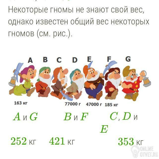 Некоторые гномы не знают свой вес, однако известен общий вес некоторых гномов (см. рис.).