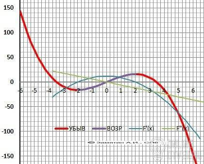 6. Производная функции.Y'(x)= -3x² +12. Корни при Х=+/- 2.