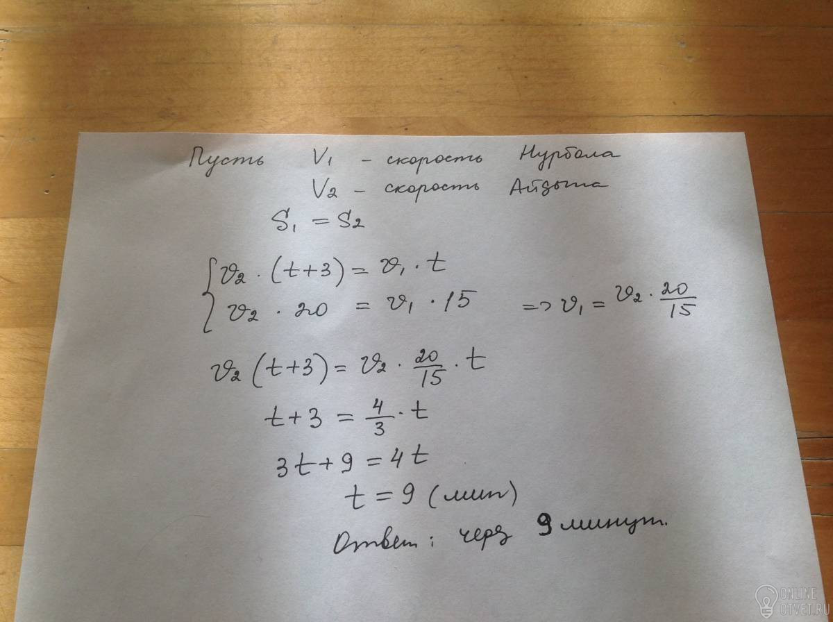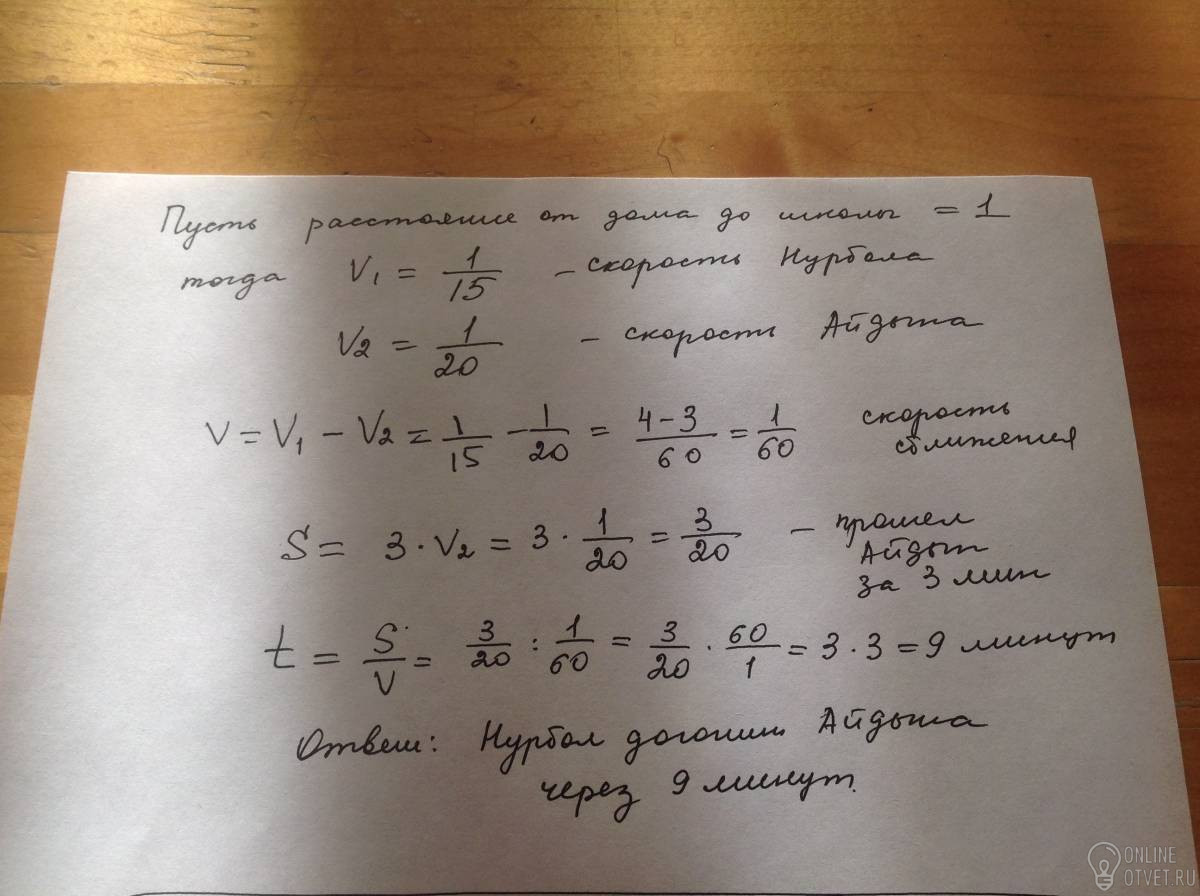 Нурбол и Айдын живут в одном доме . Расстояние от дома до школы нурбол проходит за 15мин а Айдын за 20мин . Айдын вышел из дома на 3 мин раньше нурбола . Через сколько мин нурбол догонит Айдына?