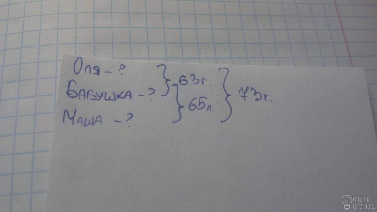 Бабушке вместе с внучкой Олей 63 года. А вместе с Машой 65.Всем им вместе 73.Сколько лет каждой из них СРОЧНО КРАТКУЮ ЗАПИСЬ