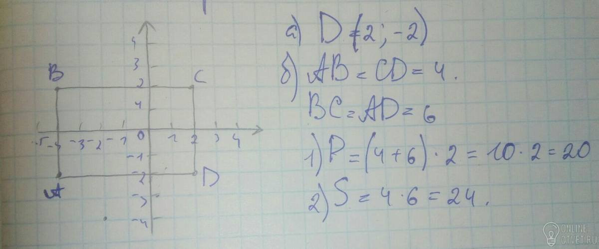 Три вершины прямоугольника есть А( -4; -2), В( -4; 2) и С( 2;2). Найдите координаты четвертной вершины. Вычислите площадь и периметр прямоугольника пожалуйста!!!