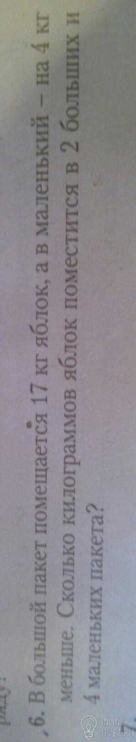 1 маленький пакет = 17 - 4 = 13 кг (Маленький пакет на 4 кг меньше большого)