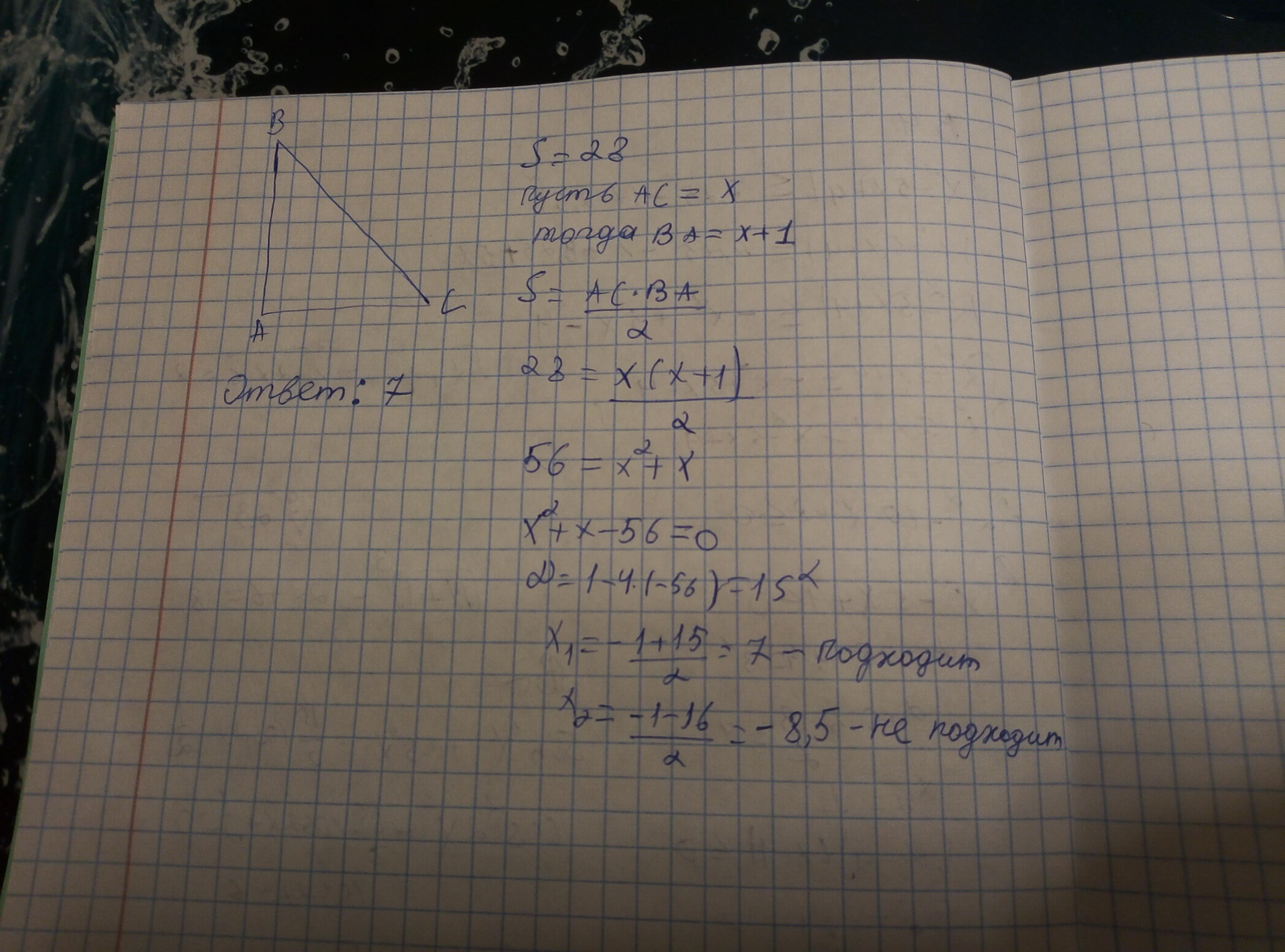 Площадь прямоугольного треугольника равна 28. Один из его катетов на 1 больше другого. Найдите меньший катет.