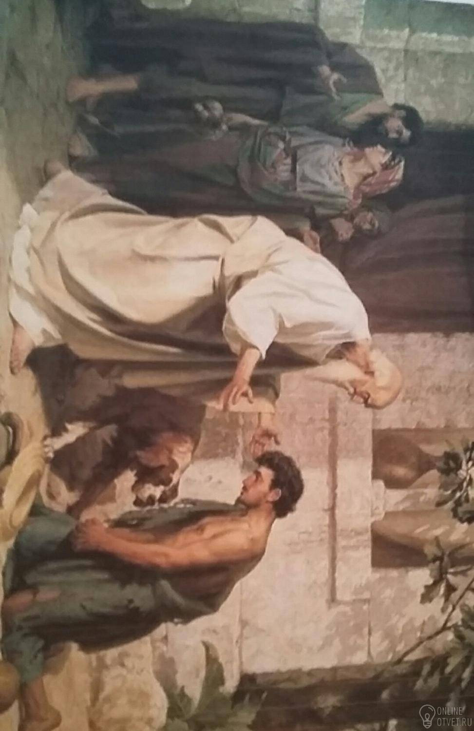 События происходят на улице, во дворе дома, ближе к его входу) Такой момент изобразил художник на картине (Молодой человек в оборванной одежде стоит на коленях перед стариком).