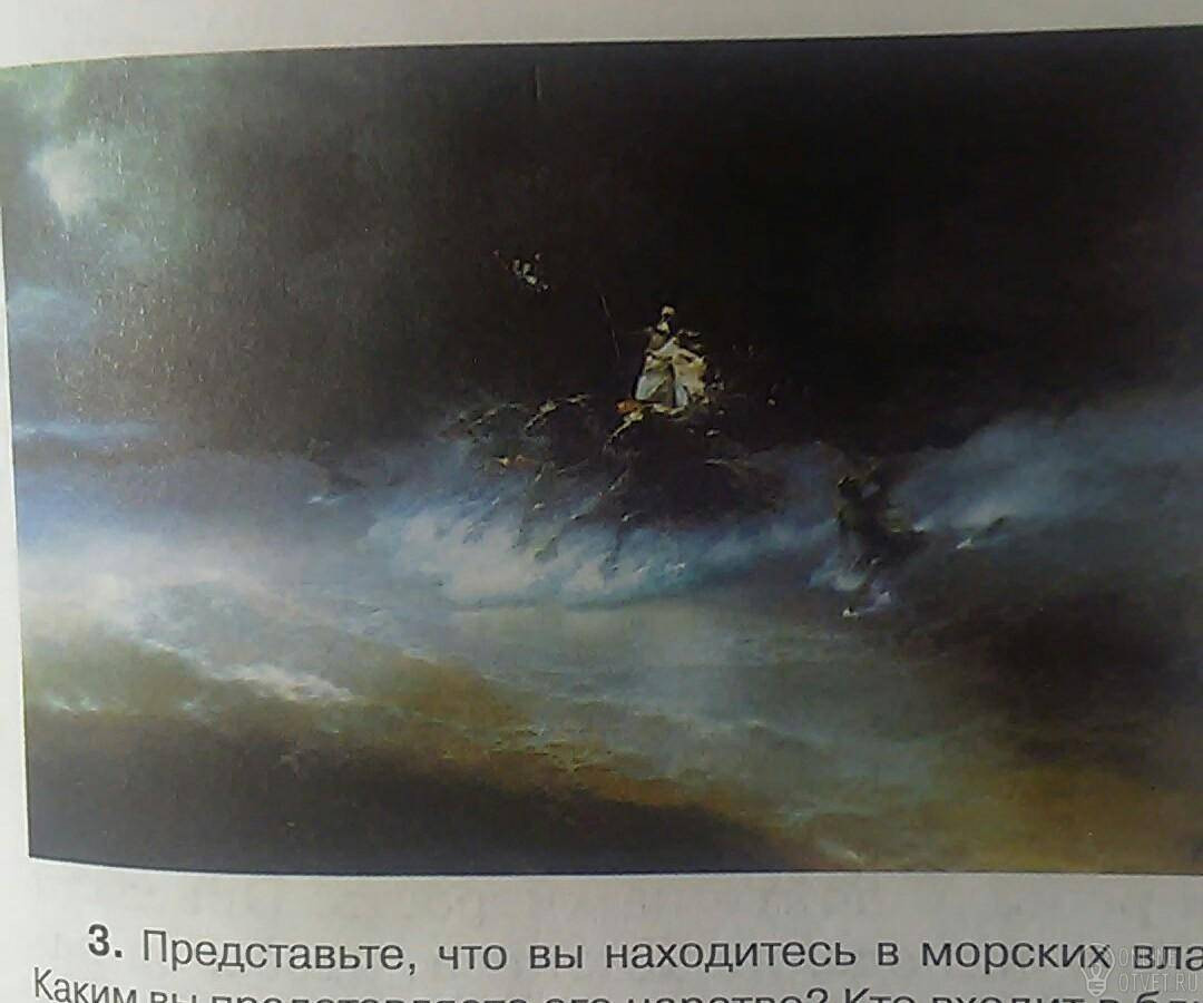 На картине изображена ночь, обстановка настороженная. Из моря по волнам мчатся кони, а на одном из них всадник. И так как нам видно все это, то значит откуда-то идёт свет. Чувствуется небольшое чувство страха, спасибо художнику за столь прекрасное творение.