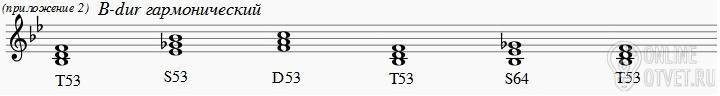 2. У гармонического мажора также есть отличительная от натурального мажора особенность: пониженная VI ступень. Аккордовая последовательность в гармоническом B-dur построена ниже (пр.2)