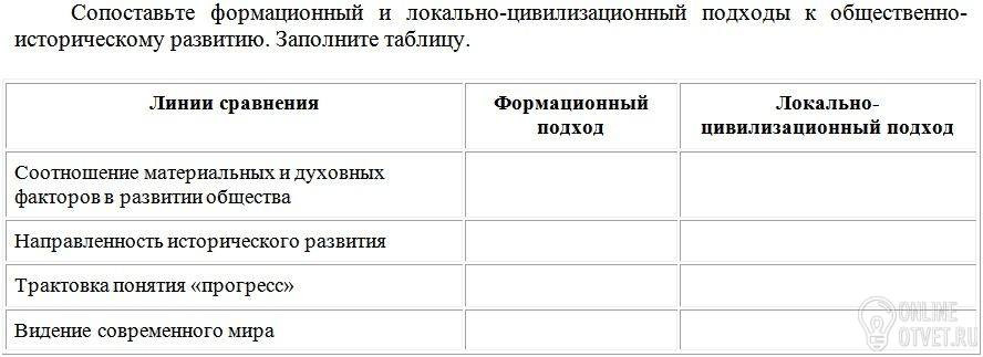 . Сопоставьте формационный и локально-цивилизационный подходы к общественно-историческому развитию. Заполните таблицу.