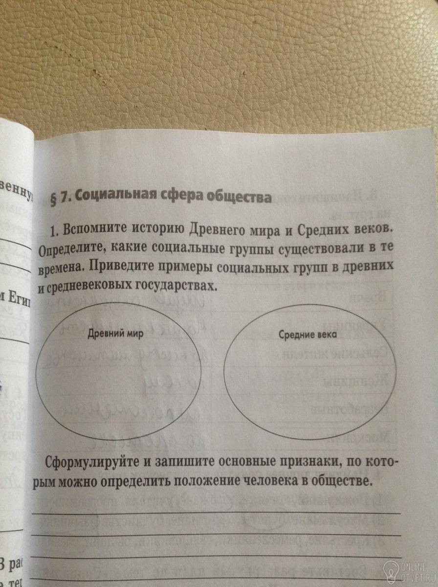 Средние века: основные группы-сословия: дворянство («те, кто воюет»), духовенство («те, кто молится»), крестьянство («те, кто работает»). Среди них: феодалы, рыцари, сеньоры, зависимые крестьяне (сервы), свободные крестьяне, церковные служители, монахи, горожане, ремесленники, торговцы. Древний мир: Индия - касты (брахманы (жрецы), кшатрии (правители, воины), вайшьи (земледельцы, купцы), шудры (неполноправные, зависимые). Египет - фараон и его семья, жрецы, военачальники, чиновники, рабы, свободные земледельцы, ремесленники, торговцы. Месопотами и Ближний Восток - знать, царские служащие (военные, придворные, жрецы, чиновники, ремесленники), рабы, изгои (хапиру), свободные земледельцы, торговцы. Китай - разделение на высших (благородных) и низших, среди которых рабы, наложницы, наемные работники, ремесленники, торговцы, главы семей, солдаты и офицеры, чиновники, придворные. Древняя Греция - свободные и рабы, граждане и неграждане (чужеземцы). Спарта - полноправные граждане, периэки (свободные, но не имеющие политических прав), рабы (илоты). Рим - патриции (сенаторы, чиновники, жрецы), всадники (воины), плебеи (земледельцы, ремесленники, торговцы), рабы.