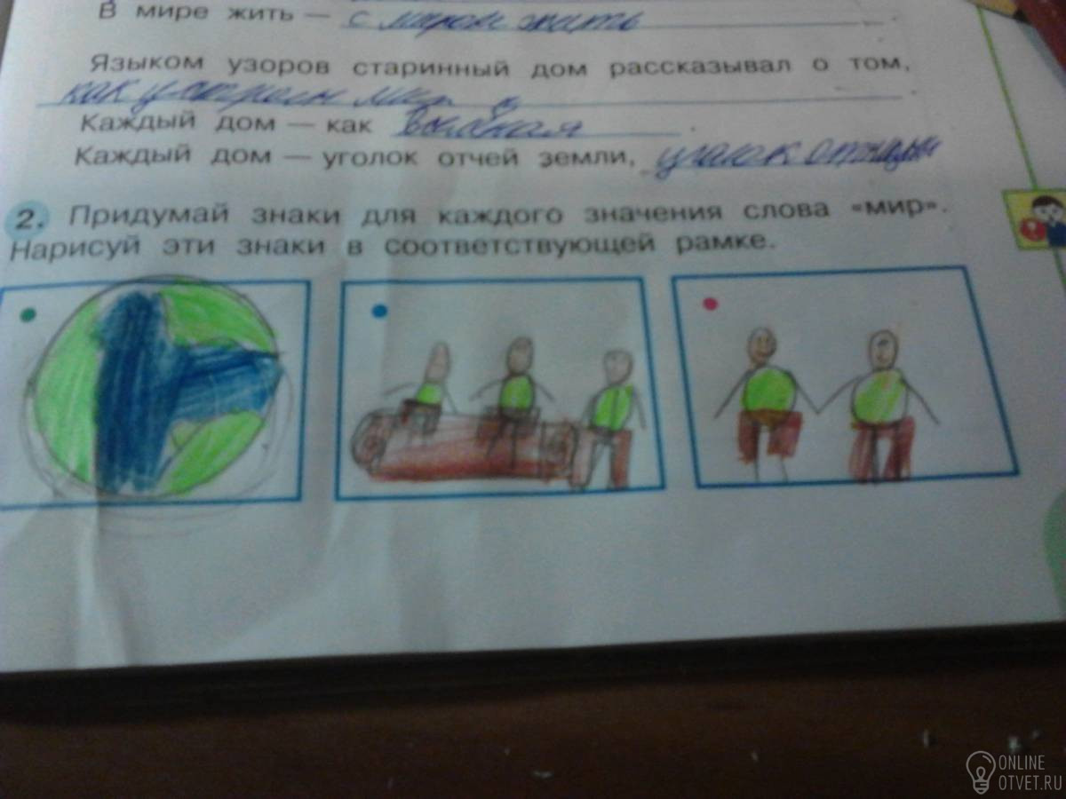 Придумайте знаки для каждого значения слово мир.нарисуйте эти знаки соответствующей рамке