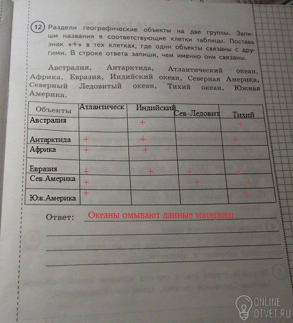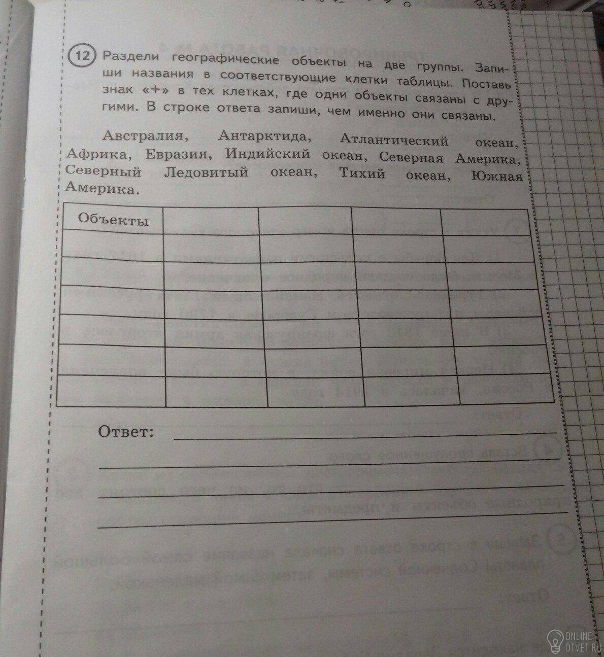 Раздели географические объекты на две группы.Запиши названия в соответствующие клетки таблицы.Поставь знак "+" в тех клетках,где одни объекты связаны с другими.В строке ответа запиши,чем именно они связаны.