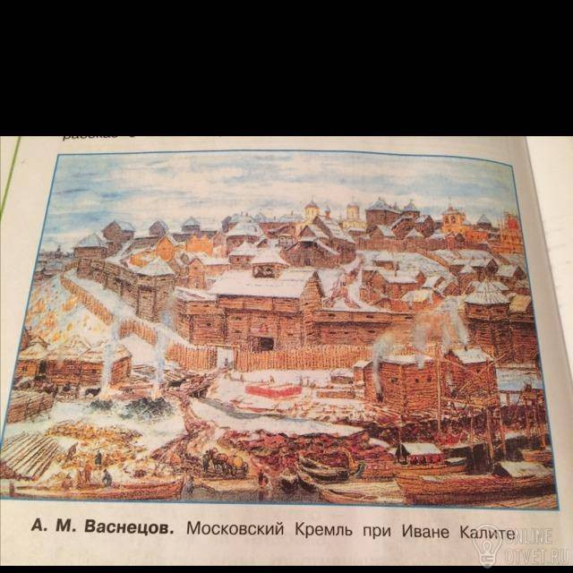 Частокол из дуба, установленный напротив кремлёвской стены, построен специально, в целях безопасности Кремля. На холме расположен княжеский терем, соединённый срубами из дерева, а к нему установлена высокая лестница. По левую сторону от княжеского двора изображён Успенский собор, выполненный из камня, а чуть поодаль, построен Архангельский собор.
