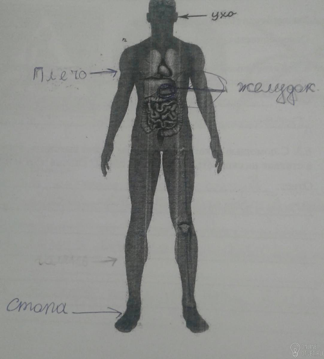 Внимательно рассмотри изображения тела человека.На рисунке стрелкой отмечен нос.Покажи стрелками и подпиши плечо, стк опу и желудок