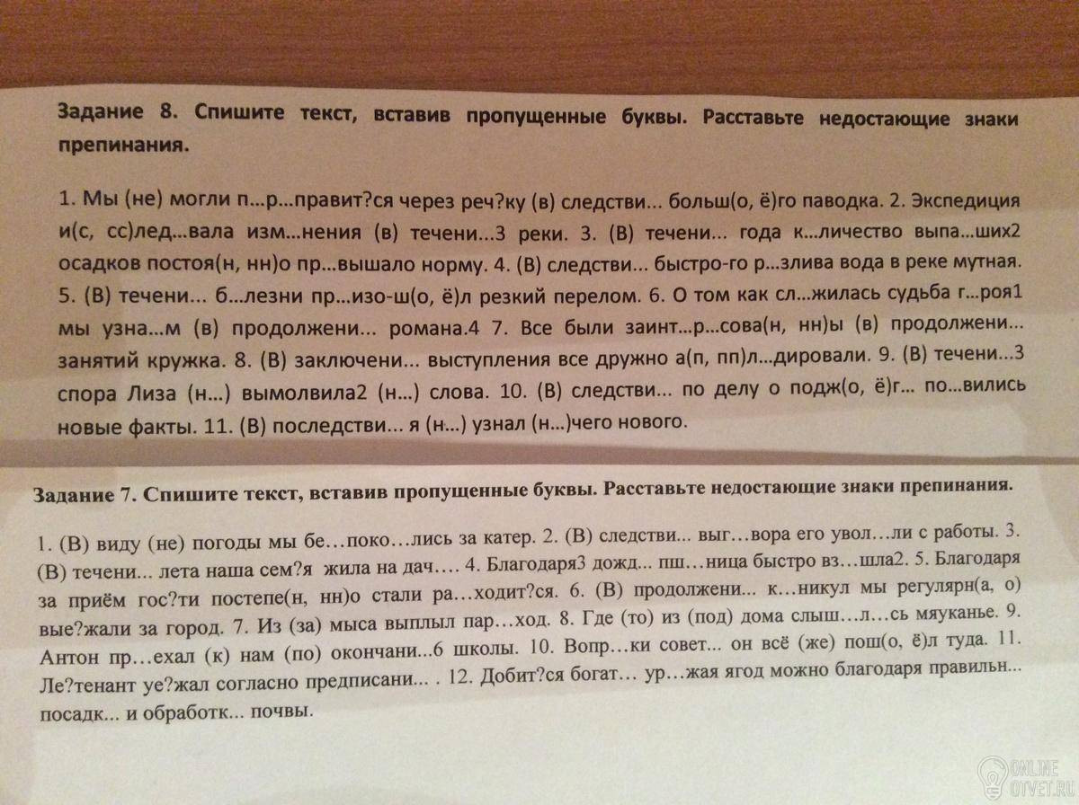 Задание 8: 1)Мы не могли переправиться через речку в следствии большого паводка.2)Экспедиция исследовала изменение в течении реки.3)В течение года количество осадков постоянно превышало норму.4)В следствии быстрого разлива ,вода в реке мутная.5)В течение болезни произошёл резкий перелом.6)О том,как сложилась судьба героя,мы узнаем в продолжении романа.7)Все были заинтересованы в продолжении занятий кружка.8)В заключении выступления все дружно апплодировали.9)В течении спора Лиза не вымолвила ни слова.9)В следствие по делу о поджоге,появились новые факты.10)В последствии я не узнал ничего нового. Задание 7: 1)В виду непогоды мы беспокоились за катер.2)В следствии выговора его уволили с работы.3)В течение лета наша семья жила на даче.4)Благодаря дождю,пшеница быстро взошла.5)Благодаря за приём,гости постепенно начали расходиться.6)В продолжение каникул,мы регулярно выезжали за город.7)Из-за мыса выплыл пароход.8)Где-то из-под дома слышалось мяуканье.9)Антон приехал к нам по окончанию школы.10)Вопреки совету,он всё же пошёл туда.11)Лейтенант уезжал согласно предписанию.12)Добиться богатого урожая ягод можно,благодаря правильной посадке и обработке почвы.