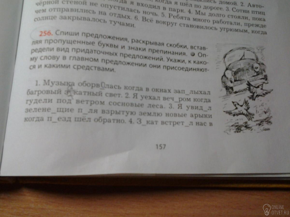 1.Музыка оборвалась,когда в окнах заполыхал багровый закатный свет.2.Я уехал вечером, когда гудели под ветром сосновые леса.3.Я увидел зеленеющие поля, взрытую землю, новые арыки, когда поезд шёл обратно.4.Закат встретил нас в Чёрном море, когда под ногами упруго ходила палуба парохода.5.Я впервые увидел эту страну в феврале, когда белый город Сухум был осыпан жёлтой пылью мимоз.6.Хохлатые степные жаворонки, цвета пыли ,взлетали из-под колёс машины, когда мы мчались вдоль лесных полос.