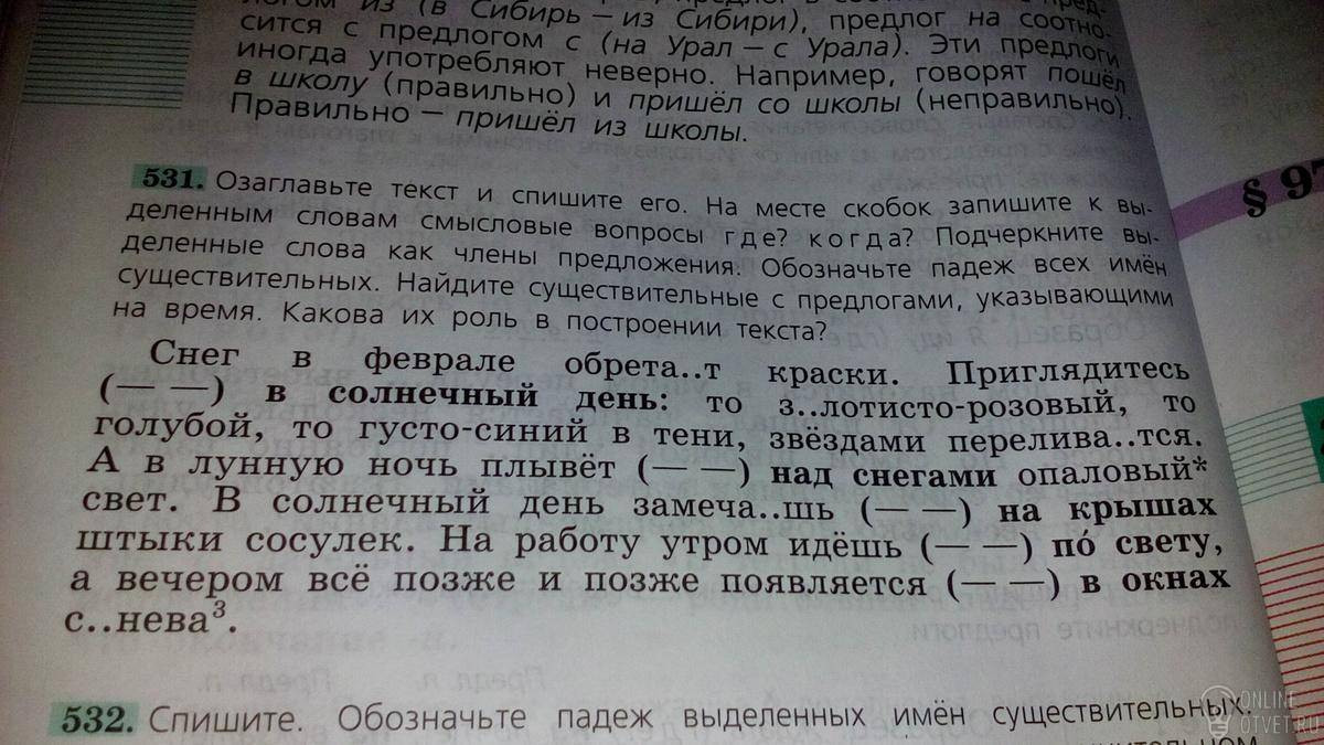 Снег в феврале обретает краски. Приглядитесь (когда?) в солнечный день: то золотисто-розовый, то голубой, то густо-синий в тени, звездами переливается. А в лунную ночь плывет (где?) над снегами опаловый свет. В солнечный день замечаешь (где?) на крышах штыки сосулек. На работу утром идешь (когда?) по свету, а вечером все позже и позже появляется (где?) в окнах синева.