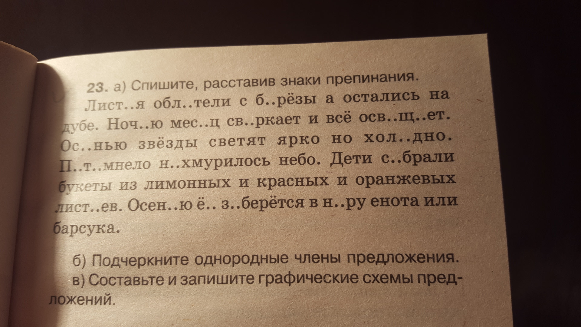 Листья облетели ,а остались на дубе. Ночью вечер сверкает и всё освещает. Осенью звёзды светят ярко, но холодно. Потемнело, нахмурилось небо. Дети собрали букеты, из лимонных и красных, и оранжевых листьев. Осенью ёж заберётся в нору енота или барсука. Однородные члены предложения-Листья--подлежащее. Облетели- сказуемое. Остались-сказуемое. Вечер-подлежащее. Сверкает-сказуемое. Освещает-сказуемое. Звёзды- подлежащее. Светят- сказуемое. Небо- подлежащее. Дети-подлежащее. Собрали-сказуемое. Ёж- подлежащее.