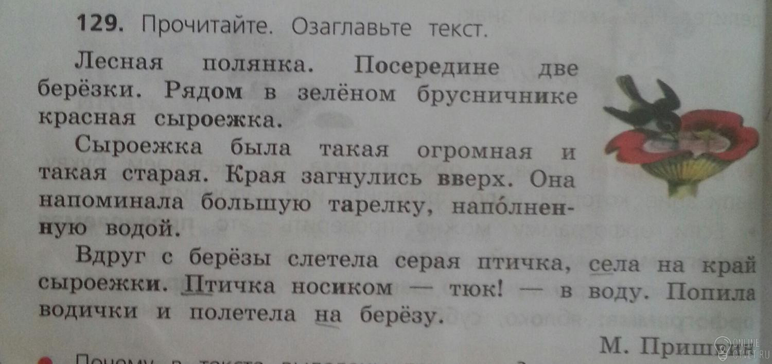вдруг с березы слетела(глаг) серая(прилаг) птичка(сущ), села(глаг) на край(обстоятельство) сыроежки. птичка(сущ) носиком - тюк! - в воду. попала(глаг) водички(сущ) и полетела( глаг) на березу..