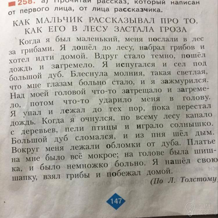 Как - то одного маленького мальчика отправили в лес за грибами. Он собрал грибов и решил пойти домой, но вдруг стало темно, пошел дождь и загремело. Он испугался и сел под большой дуб. Когда блеснула светлая молния его глазам стало больно и он зажмурился. Над его головой что затрещало, зашумело и, что - то упало ему на голову. Он упал и лежал пока дождь не закончился. Когда он очнулся то увидел что по всему лесу капало с деревьев, пели птицы и играло солнышко. Дуб сломался, а из пня шел дым. Вокруг него лежали обломки дуба, а все его платье было мокрое, на голове была шишка и голова немного болела. Он нашел свою шапку, взял корзину с грибами и побежал домой.