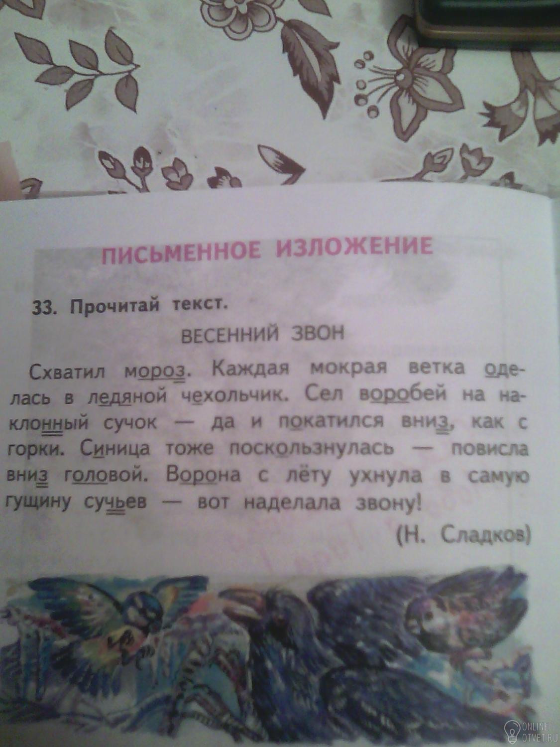 Почему текст называется" весенний звон"? про каких птиц в нем рассказывается? просмотри текст с точки зрения трудных написаний: многие из них подчеркнуты. обрати внимание на знак тире в приложениях. прочитай текст еще раз . изложи его письменно . Излагать можно своими словами.