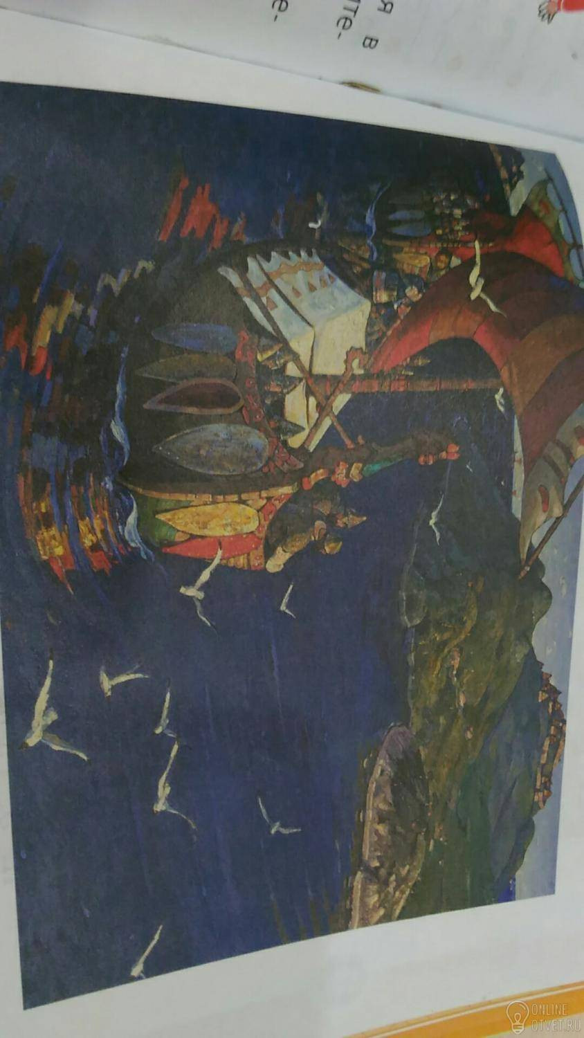 Автор в своей картине показал заморских гостей, которые прибыли в наши края. Две большие ладьи рассекают водную гладь. Купцы внимательно вглядываются в сторону дальних, незнакомых берегов. Художник очень точно и красочно изобразил все детали, все украшения на ладьях. Он показал и щиты на корме, и узорчатую резьбу. Над кормой возвышается голова дракона.